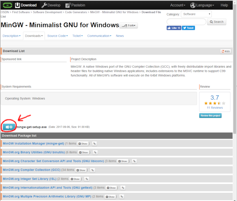 KeTCindyのインストールマニュアル通り、minGWをインストールします。minGWのホームページ (http://www.mingw.org)に行って、右上のDownloadsのタブをクリックします。次に、画像のように、中程のボタンをクリックしてmingw-get-setup.exeをダウンロードします。